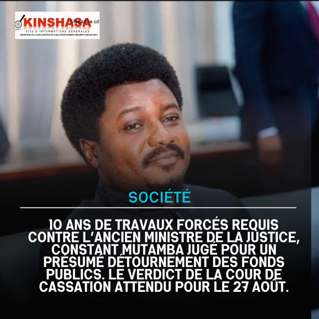 Flash Info 10 ans de travaux forcés requis contre l’ancien ministre de la justice, Constant Mutamba jugé pour un présumé détournement des fonds publics. Le verdict de la cour de cassation attendu pour le 27 août. Kinshasa Magazine 22/08/2025 Continue Reading Précédent Guyllaume Ngefa succède à Constant Mutamba au ministère de la justice.Suivant Peine de mort requise contre Joseph Kabila. 24 milliards de dollars pour dommages et intérêts sont également réclamés à l’ancien president de la RDC. Plus d'Actualité Flash Info L’Angola propose au gouvernement congolais et aux rebelles du M23 d’observer le cessez-le-feu à partir de mercredi 18 février à midi. Kinshasa Magazine 13/02/2026 Flash Info Des dégâts matériels importants enregistrés après un incendie survenu mardi au poste frontière de Lufu toto dans le Kongo Central Kinshasa Magazine 13/02/2026 Flash Info Des ex-combattants Mobondo dotés de matériels nécessaires pour leur réinsertion sociale Kinshasa Magazine 13/02/2026 Flash Info La Monusco exige des garanties sécuritaires avant redéploiement de ses troupes à Uvira Kinshasa Magazine 13/02/2026 Laisser un commentaire Annuler la réponseVotre adresse e-mail ne sera pas publiée. Les champs obligatoires sont indiqués avec *Commentaire * Nom * E-mail * Site web Enregistrer mon nom, mon e-mail et mon site dans le navigateur pour mon prochain commentaire.