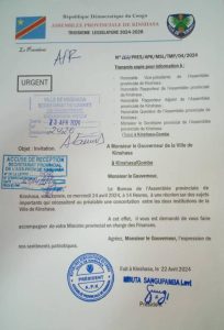 Flash Info Le gouverneur de la ville de Kinshasa, Gentiny Ngobila, invité ce mercredi 24 avril à 14 heures au bureau de l’assemblée provinciale pour une «réunion sur des sujets qui nécessitent au préalable une concertation de deux institutions de la capitale », a-t-on lu mardi 23 avril dans une correspondance signée par le président de cette institution, Levi Mbuta. Kinshasa Magazine 23/04/2024
