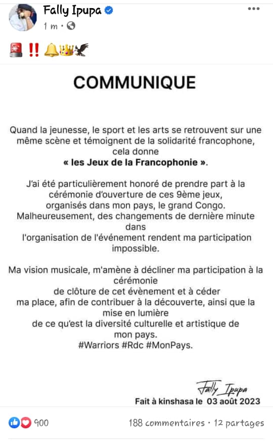 Côté Fally, un communiqué confirmant son désistement pour la clôture circule déjà dans les réseaux sociaux. « Ma vision musicale m’amène à décliner ma participation à la cérémonie de clôture de cet événement et à céder ma place afin de contribuer à la découverte ainsi que la mise en lumière de ce qu’est la diversité culturelle et artistique de mon pays » peut-on lire dans le communiqué signé de l’artiste et dont une copie à été déposée à la rédaction de Kinshasa magazine.cd. La polémique est donc terminée. Si les warriors étaient honorés à l’ouverture, les gaulois vont clôturer.