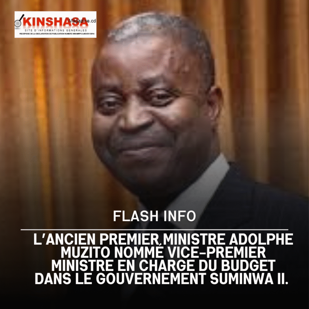 Flash Info L’ancien premier ministre Adolphe Muzito nommé vice-premier ministre en charge du budget dans le gouvernement Suminwa II. Kinshasa Magazine 22/08/2025 Continue Reading Précédent Plus de 40 fidèles catholiques tués à Komanda, territoire d’Irumu, dans la province de l’Ituri. Un carnage qui porte la signature des rebelles ougandais ADF.Suivant Presque tous les grands ténors de l’union sacrée ont été reconduits dans la nouvelle équipe gouvernementale composée de 53 membres. Plus d'Actualité Flash Info Plus de 350 personnes enlevées et 25 autres tuées dans la province congolaise de l’Ituri après une attaque des ADF Kinshasa Magazine 03/04/2026 Flash Info Après 52 ans d’une longue attente, la RDC décroche finalement son billet pour la coupe du monde dont l’édition 2026 est prévue en juin et juillet. Kinshasa Magazine 03/04/2026 Flash Info De longues files d’attente d’automobilistes et de conducteurs d’engins ont été observées lundi dans les différentes stations-service de Kinshasa Kinshasa Magazine 24/03/2026 Flash Info Des magasins appartenant à des commerçants étrangers sont restés fermés lundi sur l’avenue du Commerce, au centre-ville de Kinshasa, suite à une grève déclenchée par les travailleurs congolais. Kinshasa Magazine 24/03/2026 Laisser un commentaire Annuler la réponseVotre adresse e-mail ne sera pas publiée. Les champs obligatoires sont indiqués avec *Commentaire * Nom * E-mail * Site web Enregistrer mon nom, mon e-mail et mon site dans le navigateur pour mon prochain commentaire.