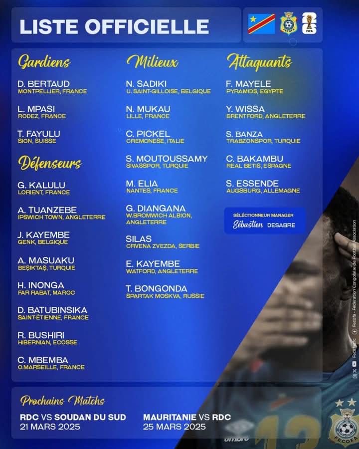 Sans surprise, le manager et sélectionneur national des léopards de la République Démocratique du Congo, Sébastien Desabre a dévoilé le mardi 4 mars dernier la liste de 25 guerriers pour le compte des éliminatoires de la coupe du monde.