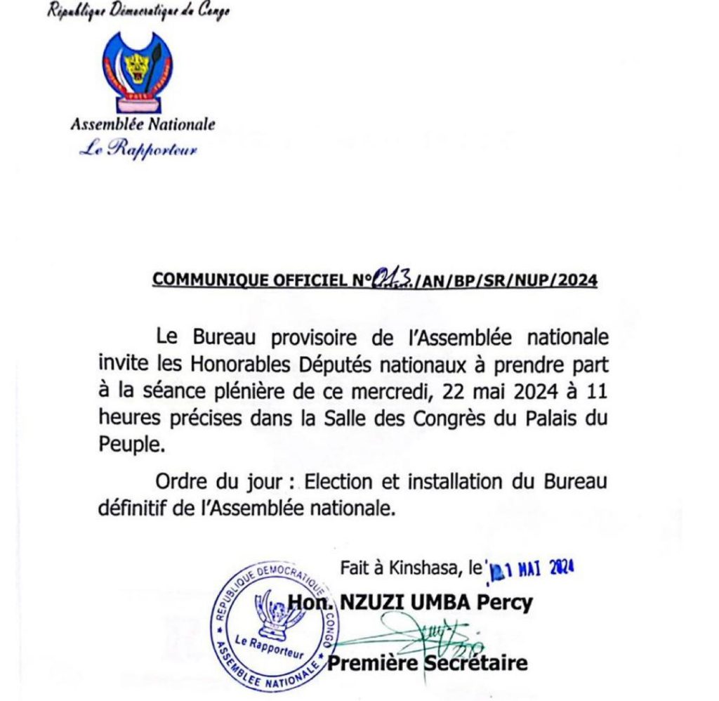 Flash Info Une plénière prévue ce mercredi à l’assemblée nationale pour élire et installer les membres du bureau définitif. Kinshasa Magazine 22/05/2024 Continue Reading Précédent L’élection des membres du bureau définitif de l’assemblée nationale annoncée pour cette semaine.Suivant Les membres du bureau définitif de l’assemblée finalement élus et installés. A la tête, Vital Kamerhe qui retrouve le perchoir de la chambre basse du parlement congolais 15 ans après l’avoir dirig. sous le règne du président Joseph Kabila. Plus d'Actualité Flash Info L’Angola propose au gouvernement congolais et aux rebelles du M23 d’observer le cessez-le-feu à partir de mercredi 18 février à midi. Kinshasa Magazine 13/02/2026 Flash Info Des dégâts matériels importants enregistrés après un incendie survenu mardi au poste frontière de Lufu toto dans le Kongo Central Kinshasa Magazine 13/02/2026 Flash Info Des ex-combattants Mobondo dotés de matériels nécessaires pour leur réinsertion sociale Kinshasa Magazine 13/02/2026 Flash Info La Monusco exige des garanties sécuritaires avant redéploiement de ses troupes à Uvira Kinshasa Magazine 13/02/2026 Laisser un commentaire Annuler la réponseVotre adresse e-mail ne sera pas publiée. Les champs obligatoires sont indiqués avec *Commentaire * Nom * E-mail * Site web Enregistrer mon nom, mon e-mail et mon site dans le navigateur pour mon prochain commentaire.